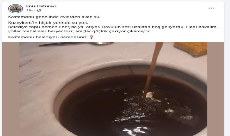 Kastamonu’da il merkezinde yaşayan bazı vatandaşlar, musluklarından akan çamurlu suyun fotoğrafını çekerek sosyal medyadan paylaşarak Kastamonu Belediyesi’ne tepki gösterdi. Bir sosyal medya kullanıcısı ise yaptığı paylaşımda, “Kastamonumuzun kar manzaralı nezih akşamlarında kahveleriniz ’Bizim Hasan’dan, (Hasan Baltacı) hem de musluklarımızdan. Bu Kastamonu nankör vilayet, daha ne yapsın bu adam” diyerek tepkisini dile getirdi.