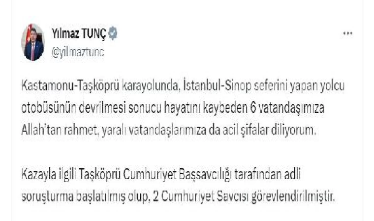 Adalet Bakanı Yılmaz Tunç, kazayla ilgili sosyal medya hesabından açıklama yaptı. Bakan Tunç, "Kastamonu-Taşköprü kara yolunda, İstanbul-Sinop seferini yapan yolcu otobüsünün devrilmesi sonucu hayatını kaybeden 6 vatandaşımıza Allah'tan rahmet, yaralı vatandaşlarımıza da acil şifalar diliyorum. Kazayla ilgili Taşköprü Cumhuriyet Başsavcılığı tarafından adli soruşturma başlatılmış olup, 2 Cumhuriyet Savcısı görevlendirilmiştir" dedi. (DHA)