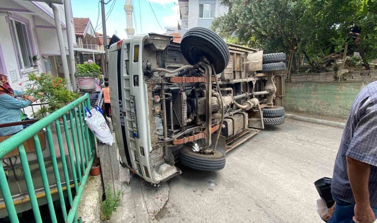 Kocaeli’nin İzmit ilçesinde yokuştan aşağı kayan kamyon önce duvara çarptı, sonra yeni alınmış otomobile çarparak devrildi. Kamyonda bulunan 3 kişi kazayı burnu bile kanamadan atlattı.