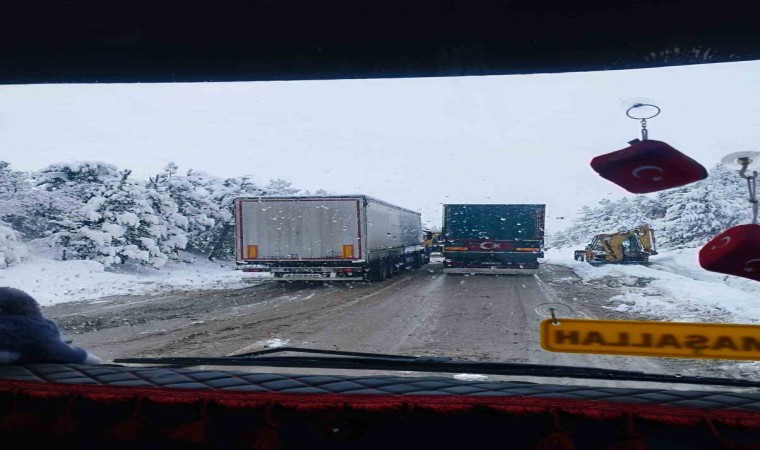 Bolu’nun Göynük ilçesinde yoğun kar yağışı ve buzlanma sebebiyle kontrolden çıkan tır kayarak trafiği aksattı.
