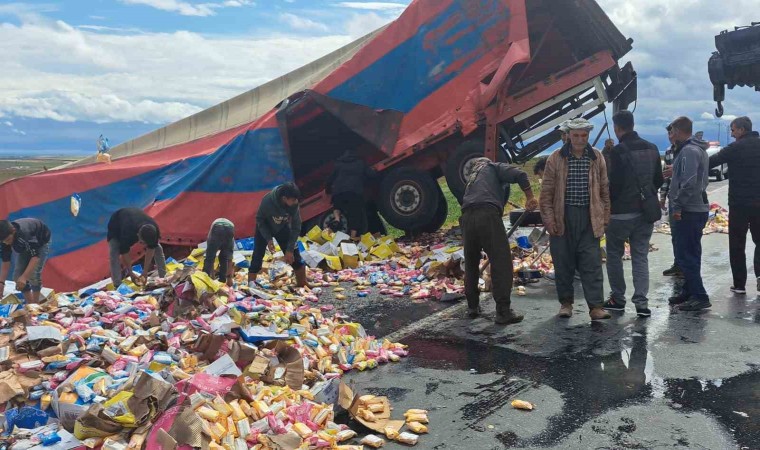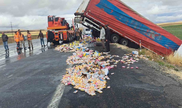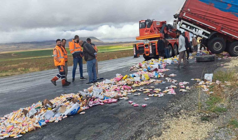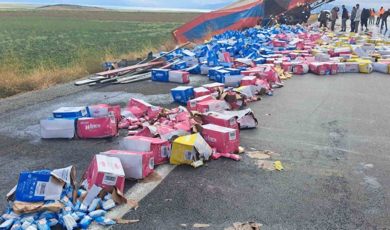 BİTLİS (İHA) – Bitlis’in Adilcevaz ilçesinde yağan yağmurdan dolayı kayganlaşan yolda tır devrilirken, dorsesindeki sabunlar ise yola saçıldı.
