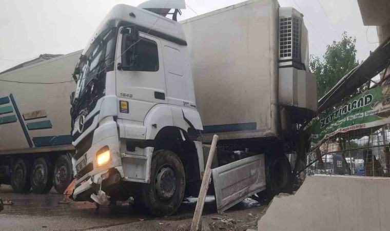 Yol kenarındaki ev ve işyerlerinin önünde bulunan saçakları yıkıp geçen tırın olay yerinden kaldırılması için polis ekipleri seferber oldu. Virajı alamayıp yan dönen tırın kaza yaptığı anlar güvenlik kameralarına saniye saniye yansıdı.