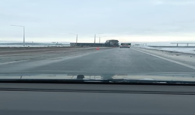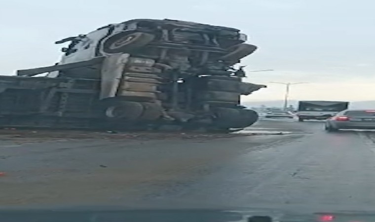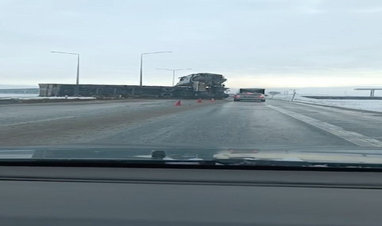 BİTLİS (İHA) – Bitlis’in Tatvan ilçesinde kar yağışı nedeniyle kayganlaşan yolda duramayan meyve yüklü tır yan yatarken sürücüsü ise yaralandı.