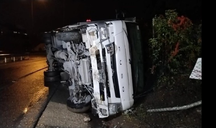 İstanbul Anadolu Yakası’nda etkili olan sağanak yağış kazaya neden oldu, virajı alamayan kamyonet yan yattı.