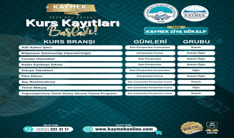 Kayseri Büyükşehir Belediyesi’nin kültür ve mesleki eğitim kuruluşu Kayseri Mesleki Eğitim ve Kültür A.Ş.’de (KAYMEK) 2024-2025 Eğitim Öğretim Yılı kurs başvuruları başladı.