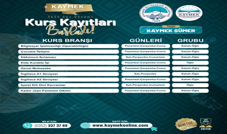 30 Eylül’de başlayacak olan Sanat ve Mesleki Eğitim kurslarına ve 1 Ekim’de başlayacak olan Genç KAYMEK Gençlik Merkezleri kurslarına www.kaymekonline.com adresinden başvurular devam ediyor.