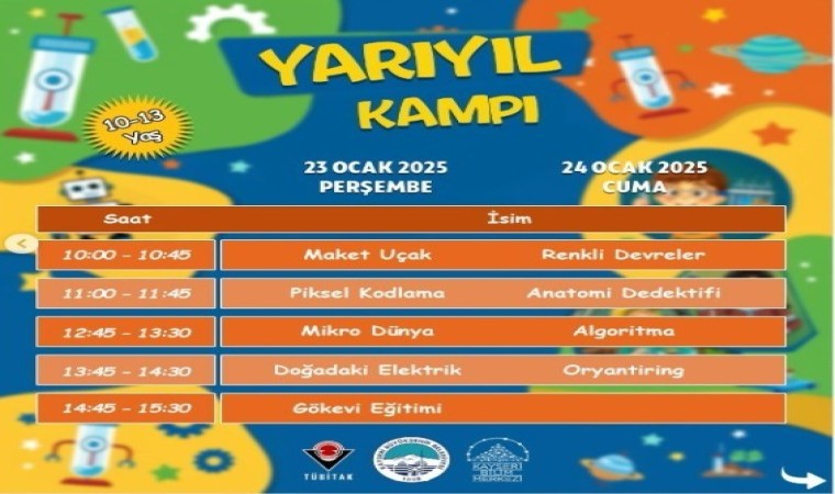 Kayseri Bilim Merkezi’nin düzenleyeceği, öğrencilerin verimli ve keyifli bir tatil geçirmelerine katkı sunacak Yarıyıl Kampı 21 Ocak’ta başlayıp ikişer günlük 4 kamp olacak şekilde planlandı.