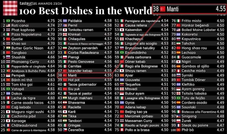 Dünyanın en kapsamlı yemek veri tabanlarından biri olan TasteAtlas tarafından, 2023 yılının en iyi 100 yemeği kullanıcıların oyları ile seçildi. Hazırlanan listeye Türkiye’den 8 yemek girerken, Kayseri mantısı da 4.55 değer ile 38. sırada yerini aldı. Kayseri Büyükşehir Belediyesi KAYTUR A.Ş. Erguvan Tesisleri’nde aşçılık yapan Gülcan Gören de lezzetli mantı yapımı ile ilgili verdiği bilgilerde, “Mantı hamuru ve kıymasıyla bir bütün olarak güzel olmalı” dedi.
