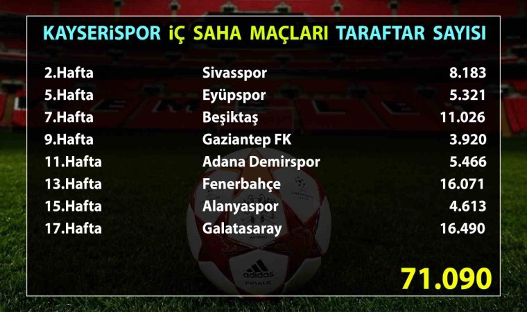 süper Lig ekiplerinden Kayserispor; ligin ilk yarısında sahasında oynadığı 8 müsabakada 71 bin 90 futbol severi tribünlere çekebildi.