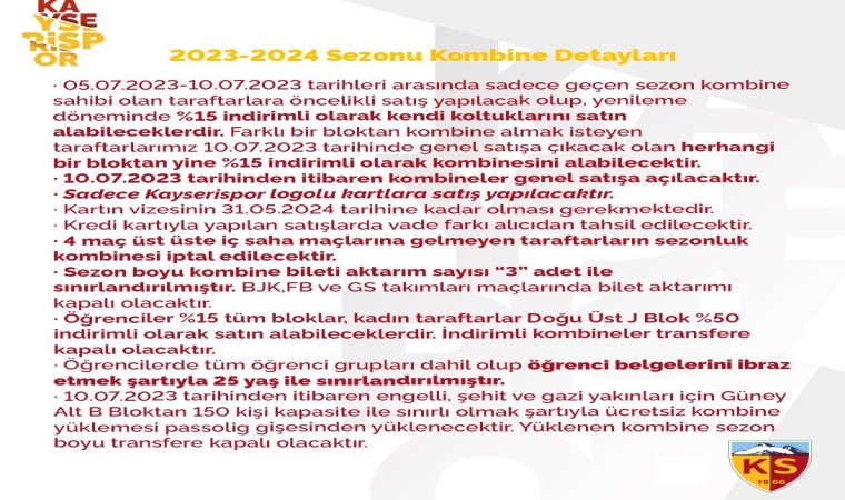 Kayserispor, 2023-2024 Süper Lig futbol sezonuna özel kombine bilet fiyatlarını açıkladı. Kulüp, kombine bilet satışlarının 10 Temmuz'da başlayacağını duyurdu ve geçen sezon kombine sahibi olan taraftarlara öncelik tanıyacak.