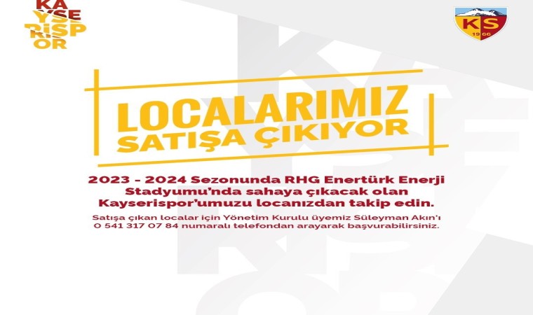 Kayserispor Kulübü, RHG Enertürk Enerji Stadyumu'ndaki localarını 2023-2024 sezonunda satışa sunmaya hazırlanıyor. Süper Lig'de mücadele eden bu kulüp, sahasında oynayacağı maçlar için localarını futbolseverlere sunacak. Kayserispor Kulübü tarafından yapılan açıklamada, "2023-2024 sezonunda RHG Enertürk Enerji Stadyumu'nda sahaya çıkacak olan Kayserispor'umuzu locanızdan takip edin. Satışa çıkan localar için Yönetim Kurulu üyemiz Süleyman Akın’ı 0 541 317 07 84 numaralı telefondan arayarak başvurabilirsiniz" şeklinde bilgi verildi. Bu locaların birkaç gün içinde satışa sunulması bekleniyor.
