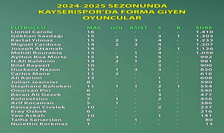 2024-205 sezonunun ilk yarısını 15 puanla noktalayan Kayserispor’da en fazla forma giyen isim Lionel Carole oldu. Fransız futbolcu, 16 maçta 1.410 dakika oynarken en az süreyi Nurettin Korkmaz aldı. En golcü ise 3 golle Boa Morte oldu.