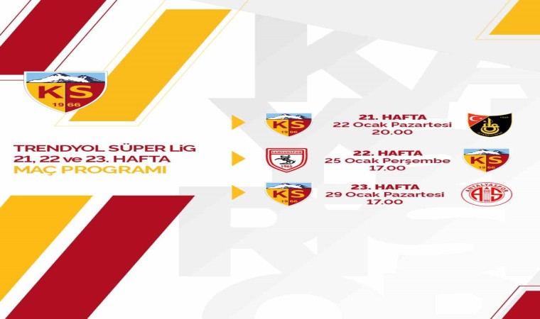 Süper Lig’de mücadele veren Kayserispor’un 21, 22 ve 23. haftalarda oynayacağı İstanbulspor, Samsunspor ve Antalyaspor maçlarının tarihleri ve saatleri belli oldu. Sarı kırmızılılar 3 haftalık dilimde 2 kez Pazartesi ve 1 kez Perşembe günü oynayacak. Kayserispor 3 haftalık dilimde 2 kez iç sahada 1 kez de dış sahada oynayacak. Türkiye Futbol Federasyonu (TFF) tarafından açıklanan programa göre Kayserispor’un 3 haftalık müsabaka trafiği ise şu şekilde: