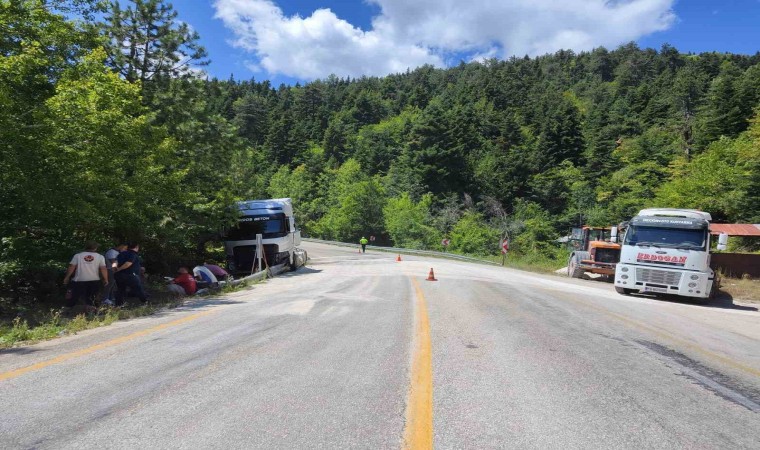 Kaza, Safranbolu-Bartın kara yolu Ahmetusta mevkiinde meydana geldi. M.T. idaresindeki 18 ABC 670 plakalı tır Bartın istikametine seyir halindeyken sürücüsünün kontrolünde çıkarak bariyere çarptı. Çarpmanın etkisiyle savrulan tırın kum dolu dorsesi devrildi. Kazadan şans eseri yaralanan olmazken yol çift yönlü ulaşıma kapanırken durumun bildirilmesi üzerine olay yerine polis ekipleri sevk edildi.