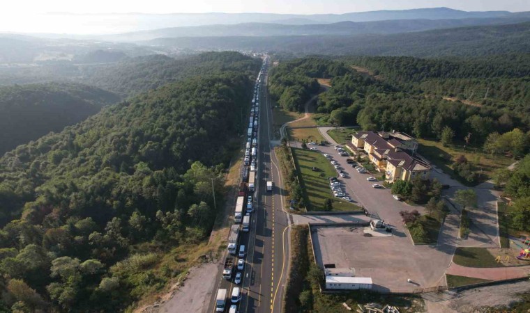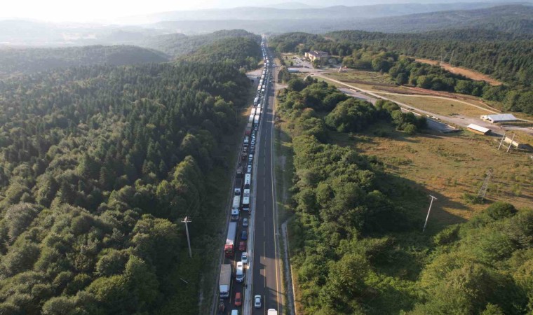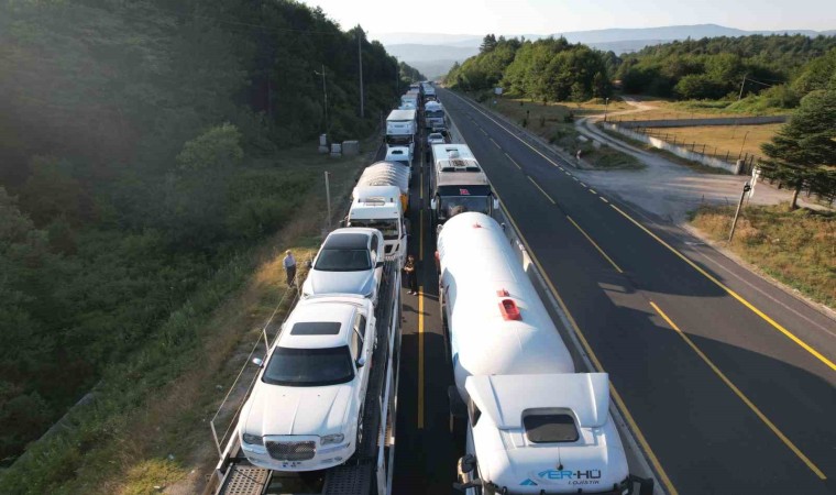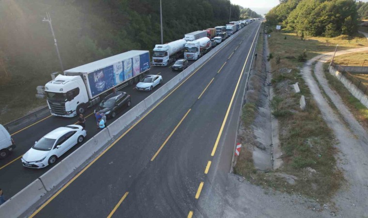 DÜZCE (İHA) – Bolu Dağı’nda sabah saatlerinde, 4 aracın karıştığı ve tırın otomobilin üzerine devrildiği kazada araçların kaldırılma çalışması trafik oluşturdu. Kilometrelerce uzunluktaki araç kuyruğu dron ile görüntülendi.