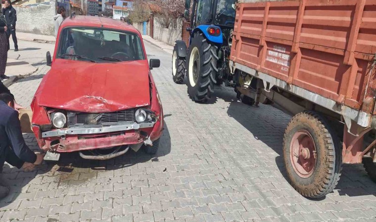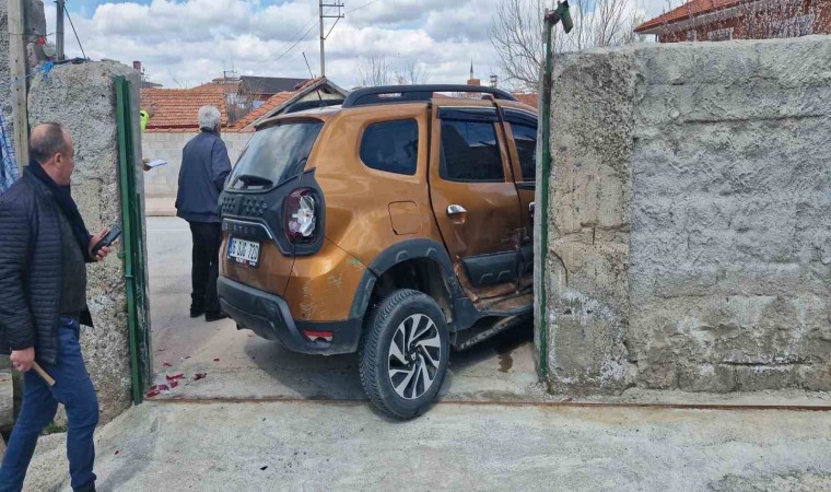 Çorum’un Alaca ilçesinde, otomobil ile çarpışan cip savrularak kapısını kırdığı bahçeye girdi.