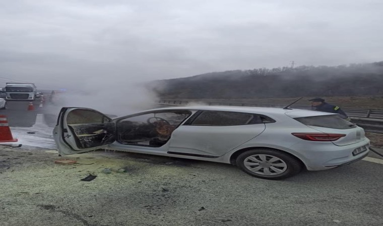 Anadolu Otoyolu’nun Bolu geçişinde bariyerlere çarparak kaza yapan otomobil alev alev yandı.