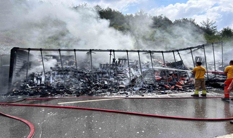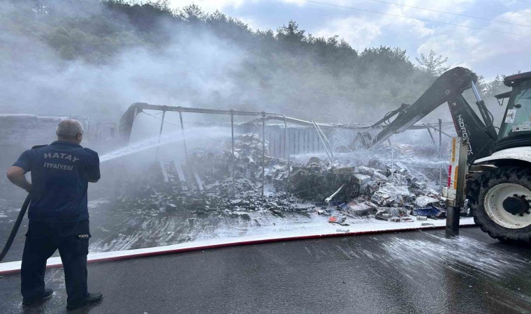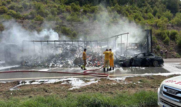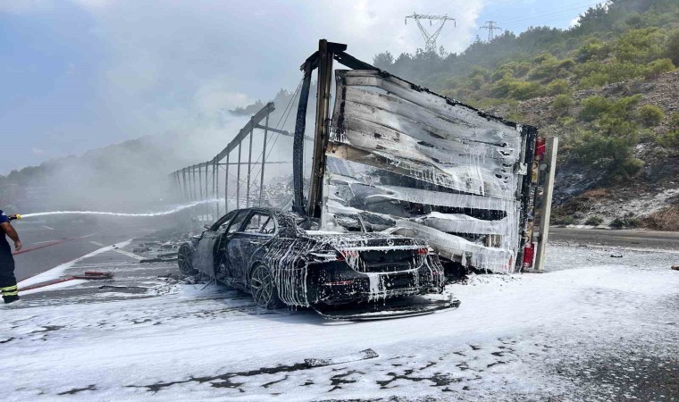 Hatay’da kaza sonrası çarpışan otomobil ve tır alevlere teslim oldu.
