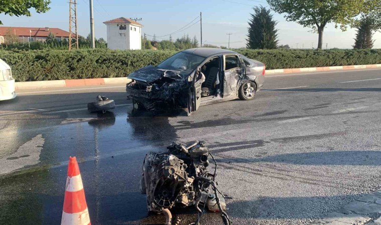 Karaman’da iki otomobilin karıştığı kazada araçlardan birinin motoru yerinden sökülerek fırladı. O anlar kameraya yansırken, kazada 2 kişi yaralandı.