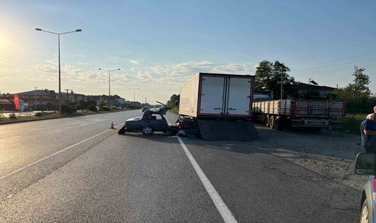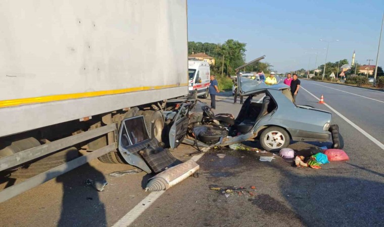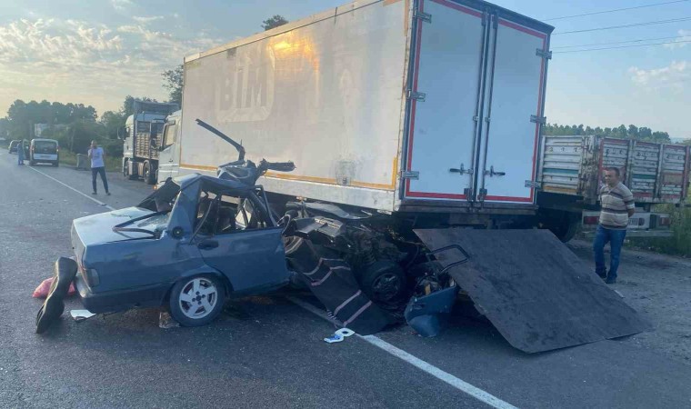 Samsun’da yoldan çıkıp park halindeki kamyona çarpan Tofaş marka otomobil parçalanırken, kazada 1 kişi hayatını kaybetti, 3 kişi ağır yaralandı.