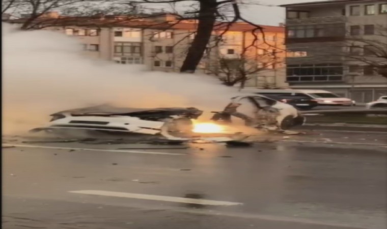 Kayseri’nin Kocasinan ilçesinde meydana gelen trafik kazasında yola savrulan Tesla marka otomobil alev alarak kullanılamaz hale geldi.