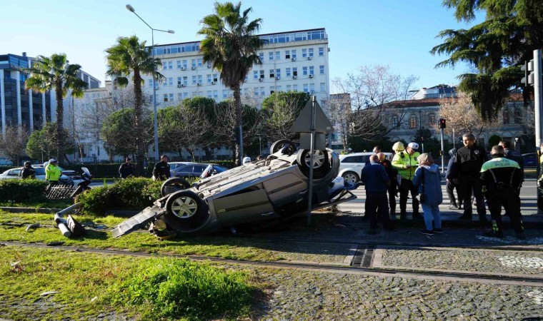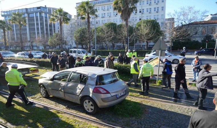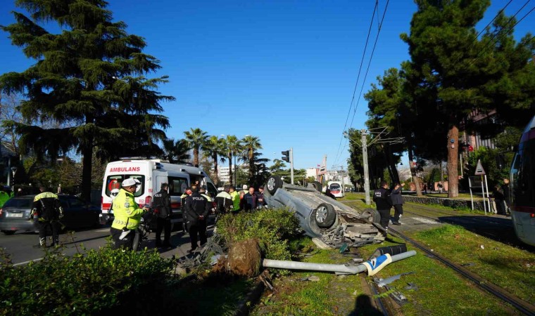 Samsun’da başka bir araçla çarpışan otomobilin tramvay hattına devrildiği kazada facianın eşiğinden dönüldü.