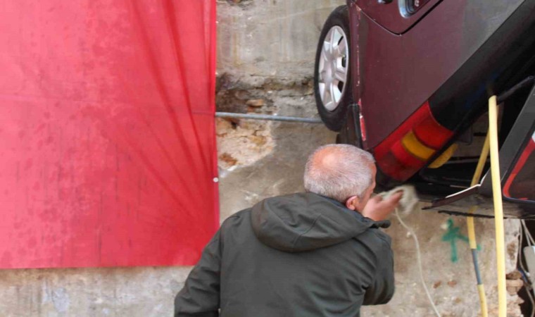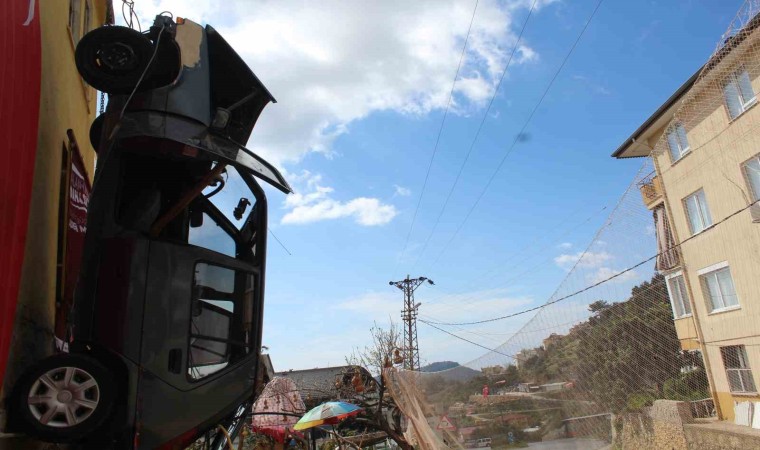 Alanya Sugözü Mahallesi’nde yaşayan 47 yaşındaki Mehmet Aydın, yaklaşık bir ay önce kaza yaptığı aracına ceza vermek için otomobili yaşadığı apartmana vinç tarzı bir mekanizmayla astı. Araç bir aydır asılı halde dururken, araç sahibi Aydın arabanın asılı olduğu iki katlı müstakil evinin bahçesini fileyle kapattı.