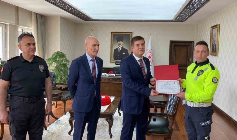 Karaman’da uygulama noktasına yaklaşan dolmuşun şoförünün rahatsızlandığını fark edip, minibüsü durdurmaya çalışan ve arkadan gelen sürücüleri uyararak kazayı önleyen trafik polisine Karaman Valisi Hüseyin Engin Sarıibrahim tarafından başarı belgesi verildi.