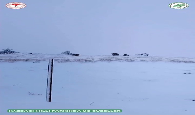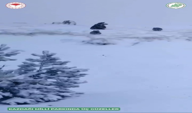 Zengin bitki örtüsü ve hayvan çeşitliliği ile dikkat çeken, Kazdağları’nda etkili olan kar yağışı, bölgeye eşsiz manzaralar sundu. Kazdağları Milli Parkı sınırları içinde, yaklaşık bin 700 metre rakımlı Kartal Çimeni mevkisinde bir ayı ve iki yavrusu, karlı zeminde koşarken Doğa Koruma ve Milli Parklar Müdürlüğü ekiplerinin kamerasına yansıdı.
