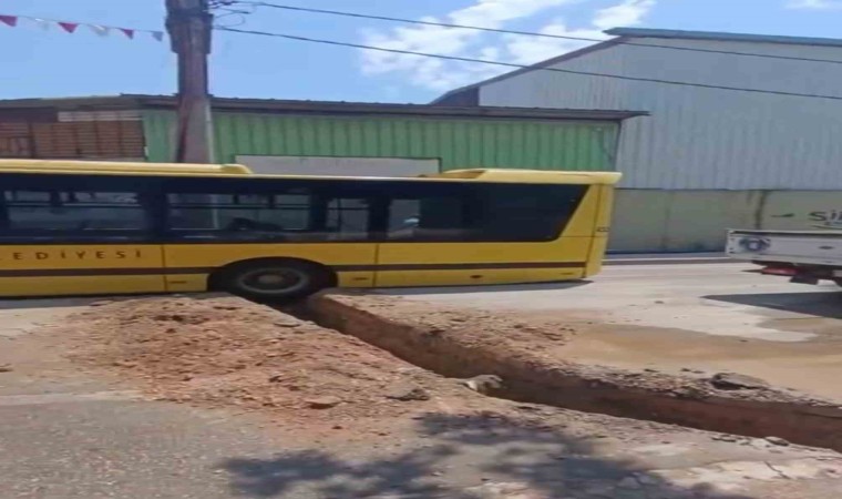 Bursa’da kazı çalışması yapılan yerden geçmek isteyen halk otobüsünün tekeri çukurda kalınca çıkamadı. Araçtaki yolcular tahliye edilirken, otobüs iş makinası yardımı ile mahsur kaldığı yerden çekildi.