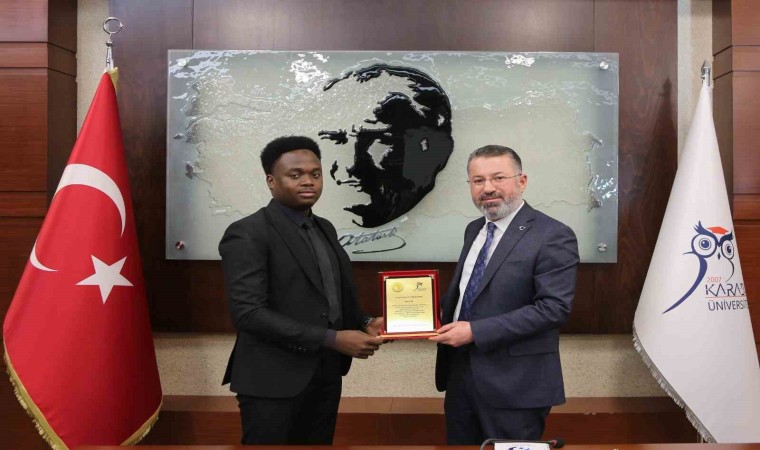 Görüşme sonunda Karabük’teki Afrikalı Öğrenciler Birliği Derneği Genel Sekreteri Mahamat Hallab, KBÜ Rektörü Kırışık’a teşekkür etmek amacıyla bir plaket takdim etti.