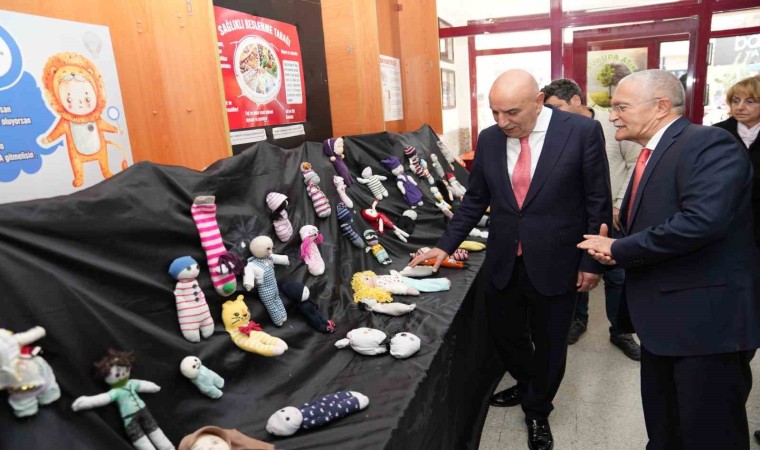 Altınok, konuşmasının ardından öğrencilerle birlikte atıkları ayrıştırarak, öğrencilerin el emeğiyle atık materyallerden yaptıkları atkı, bebek, tablo ve diğer eşyaları inceledi.