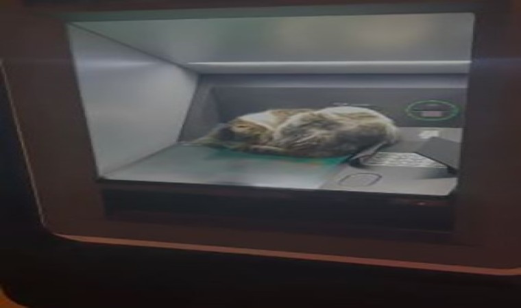 Elazığ’da bir banka ATM’sinin üzerinde yatan kediyi gören vatandaşlar, hayvanı rahatsız etmemek için başka bir ATM’ye yöneldi.