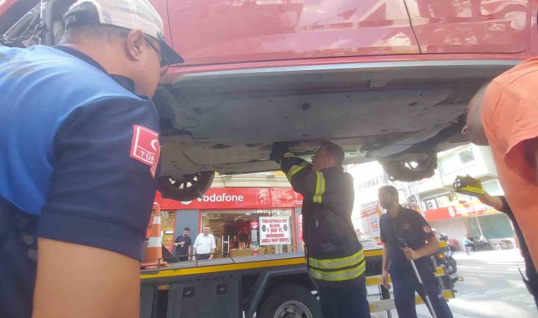Özel bir serviste yapılan çalışmanın ardından kedi otomobilden çıkartıldı.