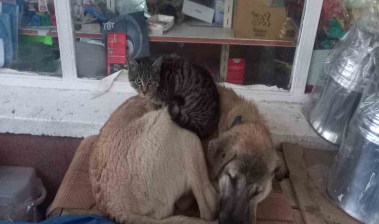 Tunceli’nin Pülümür ilçesinde üşüyen bir kedi, ısınmak için ‘düşmanının’ yanını seçti. Bir dükkanda kendisi için serilen kartonun üzerinde uyumaya çalışan köpeğin yanına kedi yanaştı. Bir süre köpeğin üzerinde gezinen kedi kendine yer olarak köpeğin üstünü seçti. Birbirlerine ‘düşman’ olarak bilinen kedi ve köpeğin görüntüleri izleyenlerin yüreklerini ısıttı.