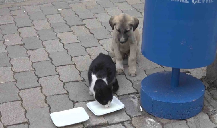 Amasya’nın Taşova ilçesinde soğuk havada birbirine sokulan kedi ve köpeğin görüntüsü yürekleri ısıttı.