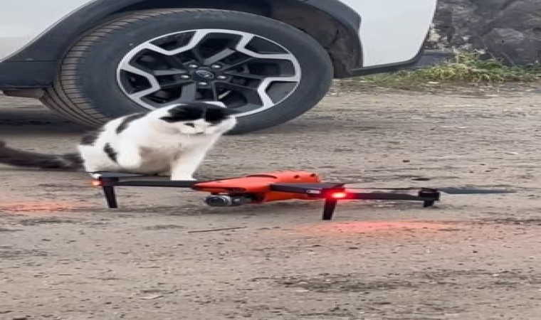 Tekirdağ’da bir kedinin uçuşa hazırlanan dron cihazına defalarca pati attığı anlar hem cep telefonu hem de dron kamerasına yansıdı.