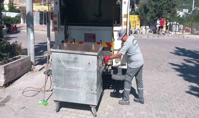 Kemer Belediyesi, ilçe genelindeki çöp konteynerlerini yıkadıktan sonra dezenfekte ediyor.
