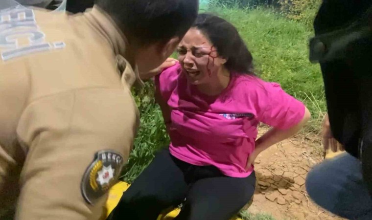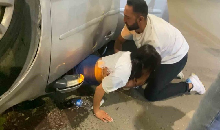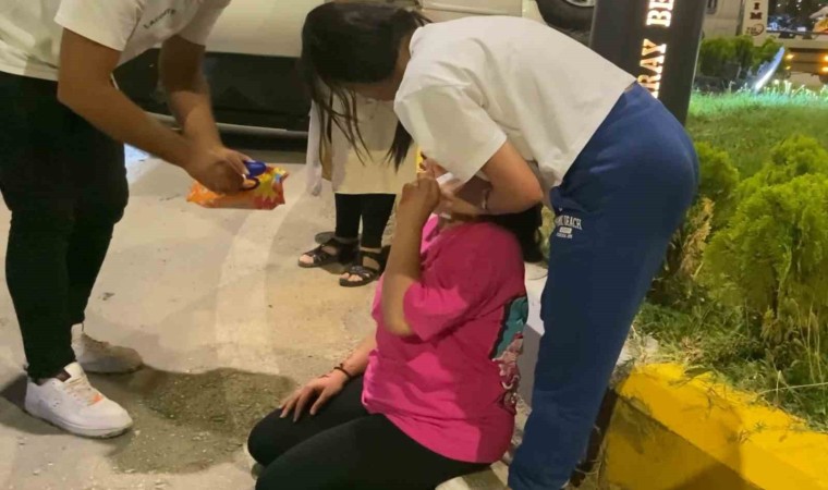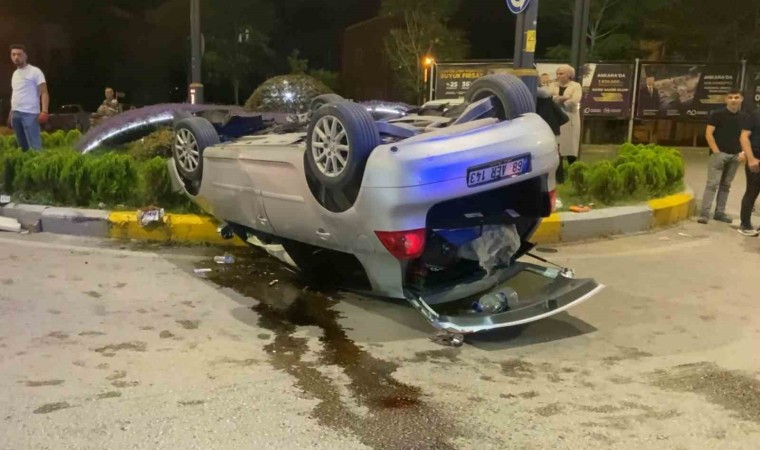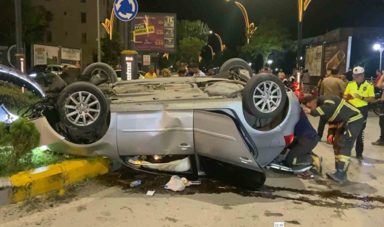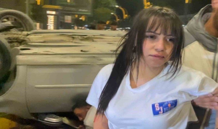 Aksaray’da sürücüsünün direksiyon hakimiyetini kaybettiği otomobil dönel kavşağa çarparak takla attı. Ters dönen otomobilde sıkışan yaralı kadın sürücü araçtan çıkarılır çıkarılmaz hamile olan arkadaşına koşup onun yarasını sardı.