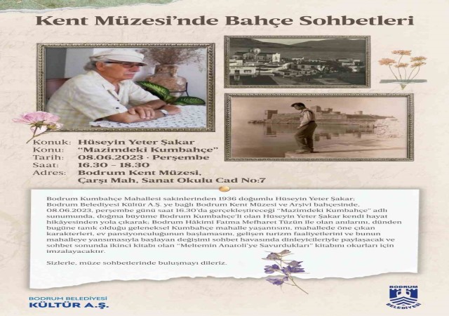 İlk söyleşi, Bodrum Kumbahçe Mahallesi'nin yerlilerinden Hüseyin Yeter Şakar'ın katılımıyla gerçekleşecek. 1936 doğumlu Şakar, 8 Haziran Perşembe günü saat 16.30'da Bodrum Kent Müzesi ve Arşivi bahçesinde "Mazimdeki Kumbahçe" başlıklı sunumuyla Bodrum'un yerel yaşamına ışık tutacak. Kendi yaşam hikayesi ve Bodrum'daki geçmişe tanıklığı üzerinden, Kumbahçe Mahallesi'nin tarihini, geleneklerini, önemli kişiliklerini, turizmin mahalleye etkilerini ve daha fazlasını anlatacak.