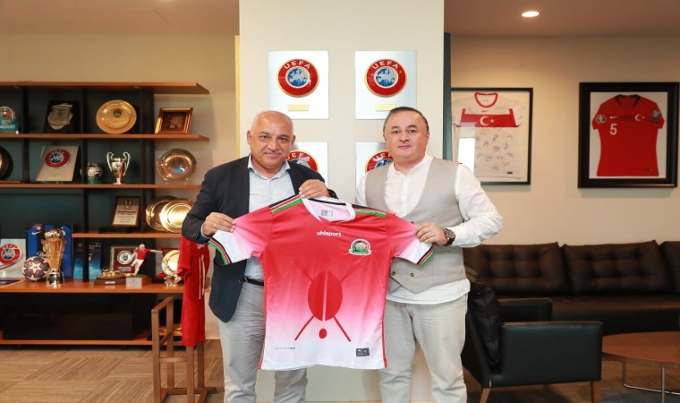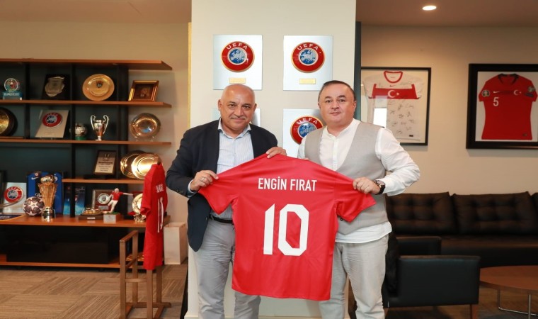 TFF Başkanı Mehmet Büyükekşi görevinde başarılar dilediği Engin Fırat’a A Milli Takım forması takdim ederken, Fırat da kendisine Kenya Milli Takım forması verdi.