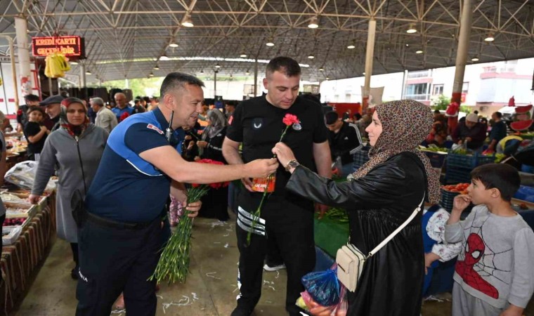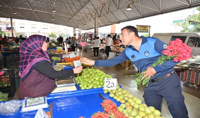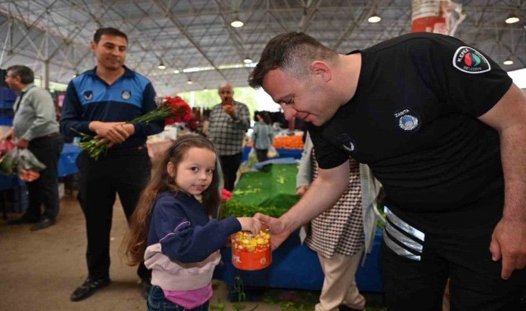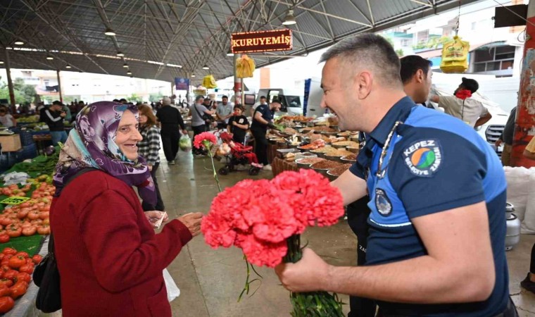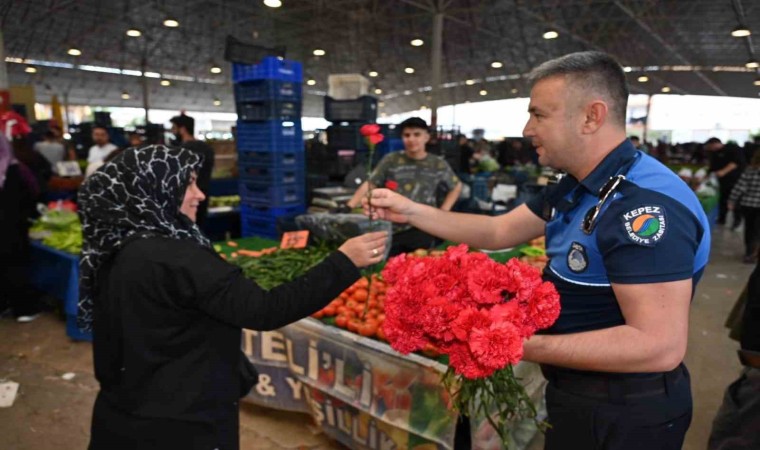 Kepez Belediyesi Zabıta Müdürlüğü ekipleri, Ramazan Bayramı arifesinde bayram alışverişi yapan vatandaşlara çiçek ve bayram şekeri dağıttı.