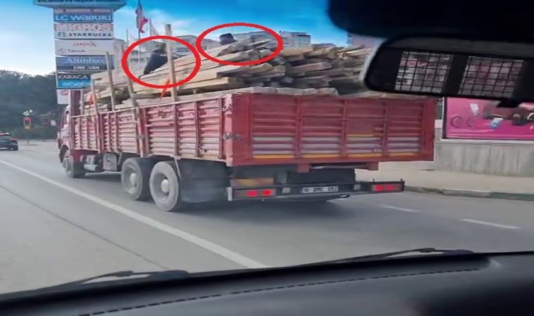 Olay, merkez Osmangazi ilçesi Demirtaş Mahallesi’nde meydana geldi. Sürücüsü ve plakası henüz öğrenilemeyen kereste yüklü kamyon, kerestelerin üzerinde 2 genci de taşıdı. Gençlerin tehlikeli yolculuğunu gören diğer sürücüler, kamyon şoförüne kornalı ikazda bulunsa da sonuç alamadı. Gençlerin ölüme meydan okuduğu anlar saniye saniye amatör kameraya yansıdı.