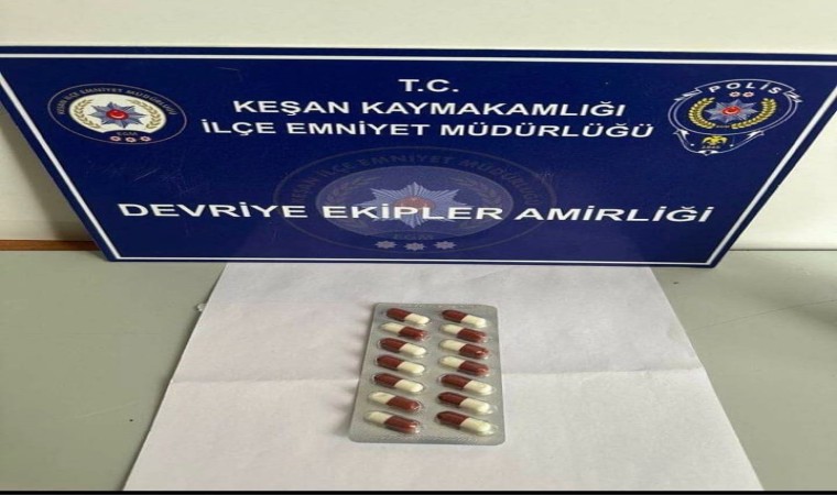 Edirne’nin Keşan ilçesinde, polisin durdurduğu şüphelinin üst aramasında 14 adet sentetik ecza ele geçirildi.