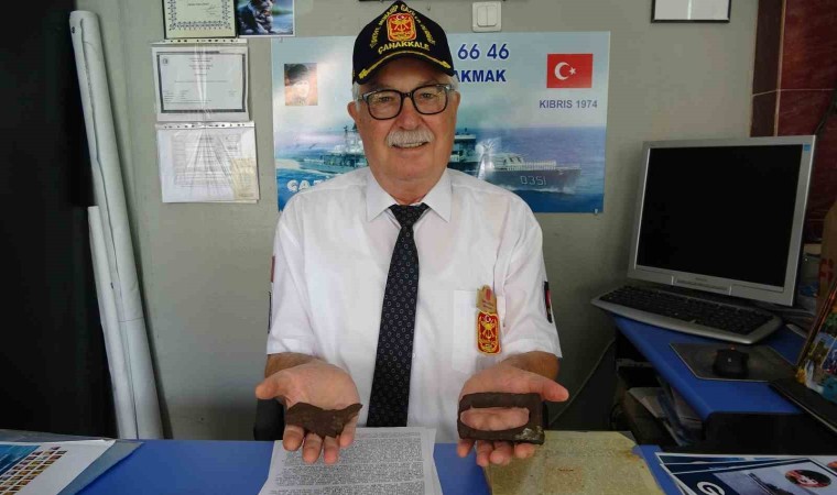Çanakkale’de yaşayan Kıbrıs Gazisi Hakkı Gürses, Kıbrıs Barış Harekatı’nda görev yaptığı Mareşal Fevzi Çakmak Gemisi’ne uçaksavarlar tarafından isabet eden şarapnel parçalarını 50 yıldır saklıyor.