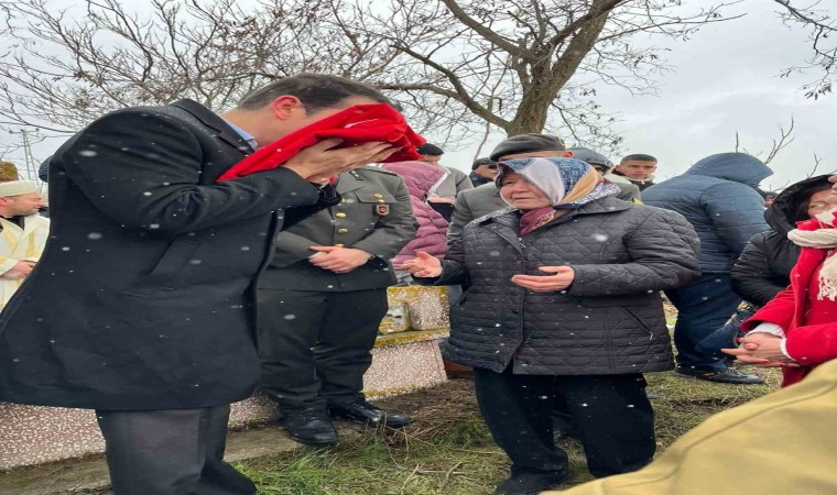 Kaymakam Köksal, Kıbrıs Gazisi Celal Kutlufan’ın tabutuna örtülen Türk bayrağını gazinin çocuklarına teslim ederek, defin sonrası taziyeleri kabul eden ailesine başsağlığı dileklerini sundu.