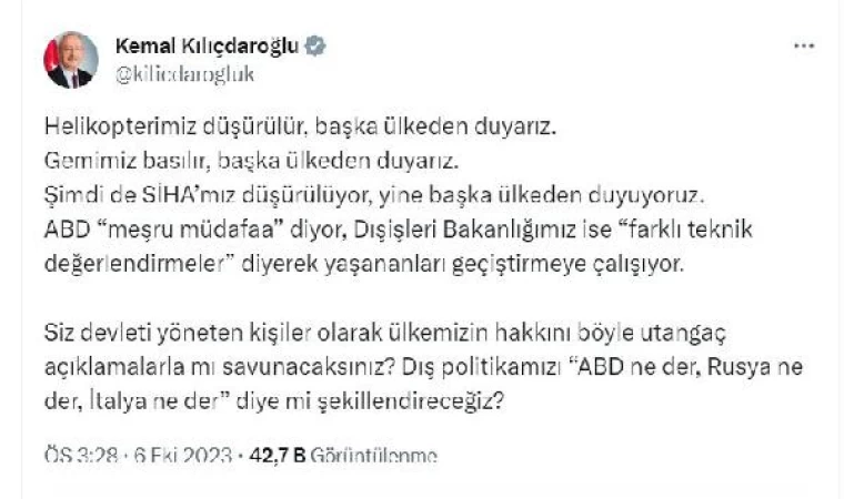 Kılıçdaroğlu, sosyal medya hesabından yaptığı açıklamada, "Helikopterimiz düşürülür, başka ülkeden duyarız. Gemimiz basılır, başka ülkeden duyarız. Şimdi de SİHA'mız düşürülüyor, yine başka ülkeden duyuyoruz. ABD 'meşru müdafaa' diyor, Dışişleri Bakanlığımız ise 'farklı teknik değerlendirmeler' diyerek yaşananları geçiştirmeye çalışıyor. Siz devleti yöneten kişiler olarak ülkemizin hakkını böyle utangaç açıklamalarla mı savunacaksınız? Dış politikamızı 'ABD ne der, Rusya ne der, İtalya ne der' diye mi şekillendireceğiz?" ifadelerini kullandı. (DHA)