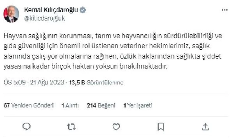 Kılıçdaroğlu, sosyal medya hesabından yaptığı açıklamada, "Hayvan sağlığının korunması, tarım ve hayvancılığın sürdürülebilirliği ve gıda güvenliği için önemli rol üstlenen veteriner hekimlerimiz, sağlık alanında çalışıyor olmalarına rağmen, özlük haklarından sağlıkta şiddet yasasına kadar birçok haktan yoksun bırakılmaktadır. Saray iktidarının birçok alanda olduğu gibi, tarım ve hayvancılık politikalarındaki eksiklikleri ve ihmalleri, veteriner hekimlerimizin maruz kaldığı sorunlar; ülkemizde tarım ve hayvancılığın geleceği için daha da ciddi bir tehdit oluşturmaktadır. Hayvan sağlığının korunması, tarım ve hayvancılığın sürdürülebilirliği ve gıda güvenliği için vazgeçilmez olan veteriner hekimlerimizin sorunlarını çözmek için derhal etkili adımlar atılmalıdır. Seslerini duyurmak için bugün meydanlara inen veteriner hekimlerimizin daima yanlarında olduğumuzu, yaşadıkları sorunların çözümü için takipçisi olacağımızı belirtiyor, saygı ve selamlarımı iletiyorum" dedi. (DHA)