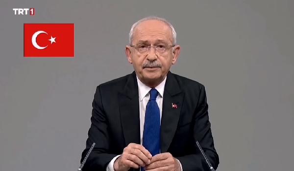 Millet İttifakı Cumhurbaşkanı Adayı ve CHP Genel Başkanı Kemal Kılıçdaroğlu, Cumhurbaşkanlığı seçimleri için Seçim Kanunu uyarınca kendisine tanınmış olan konuşmasını TRT 1 TV'de yaptı. İkinci ve son konuşmalar 13 Mayıs'ta yapılacak.