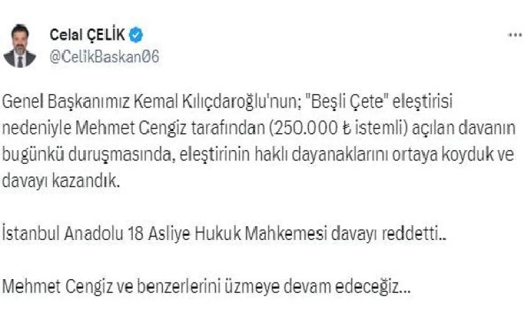 CHP Genel Başkanı Kemal Kılıçdaroğlu'nun avukatı Celal Çelik, mahkemenin kararını Twitter hesabından paylaşım yaparak duyurdu. Çelik, "Genel Başkanımız Kemal Kılıçdaroğlu'nun; 'Beşli çete' eleştirisi nedeniyle Mehmet Cengiz tarafından 250 bin TL istemli açılan davanın bugünkü duruşmasında, eleştirinin haklı dayanaklarını ortaya koyduk ve davayı kazandık. İstanbul Anadolu 18'inci Asliye Hukuk Mahkemesi davayı reddetti. Mehmet Cengiz ve benzerlerini üzmeye devam edeceğiz" dedi. (DHA)